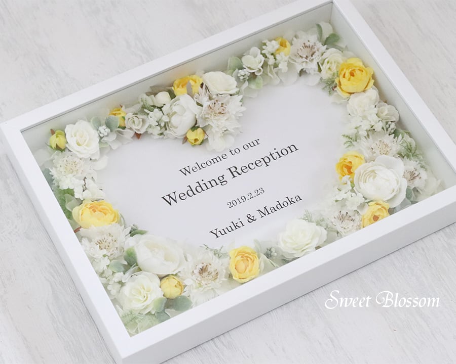ボックスフレームの中にお花をアレンジするウェルカムボードです。