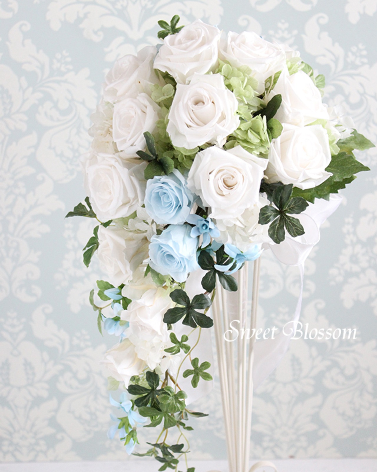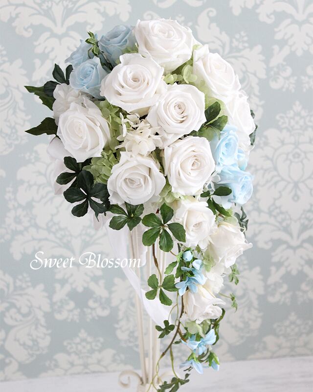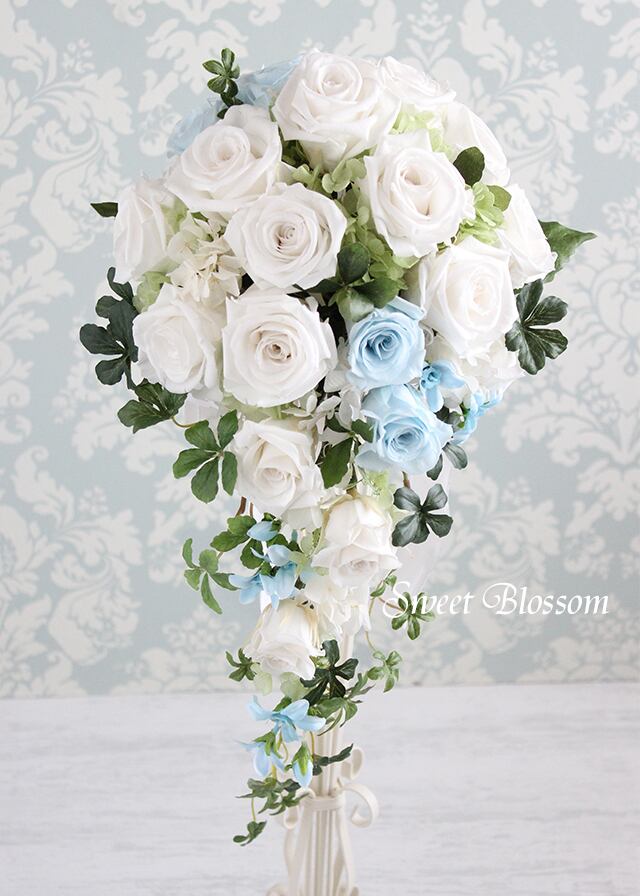 真っ白のバラにサムシングブルーの爽やかなベビーブルーのバラの組み合わせに流れるようにグリーンをあわせたプリザーブドフラワーのウエディングブーケです。